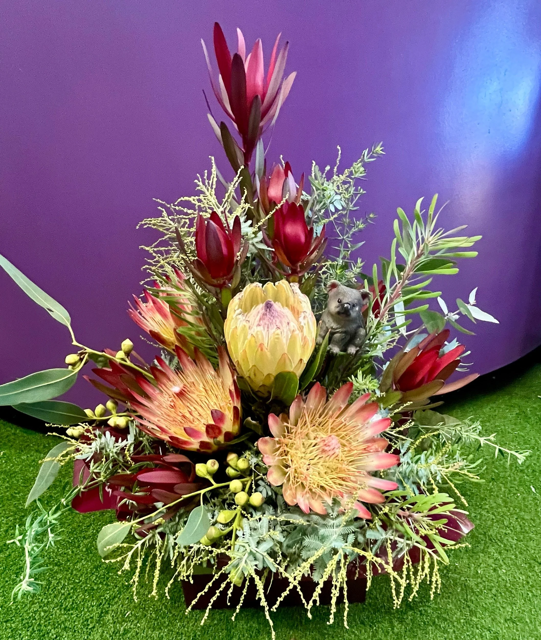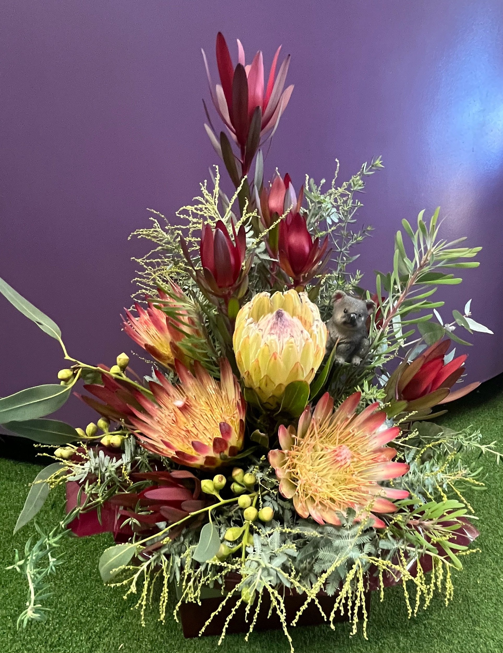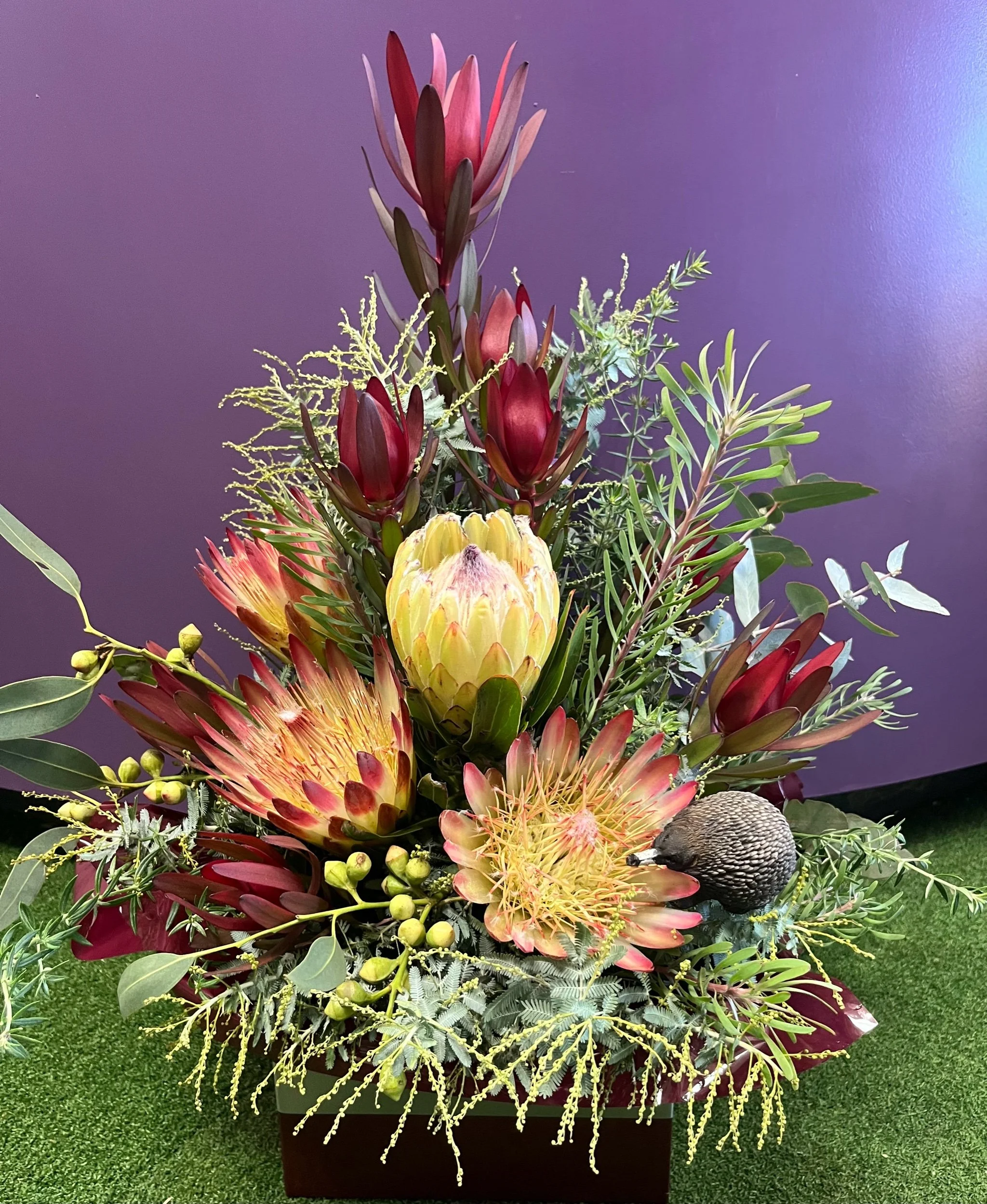 Shop › Native Premium Arrangement Image 1 of 3 Image 2 of 3 Image 3 of 3 Native Premium Arrangement $120.00 Box arrangement of seasonal native flowers with an Australian animal pick or pot sitter for the garden as a keepsake 🐨 🦔 Add To Cart Added! Box arrangement of seasonal native flowers with an Australian animal pick or pot sitter for the garden as a keepsake 🐨 🦔