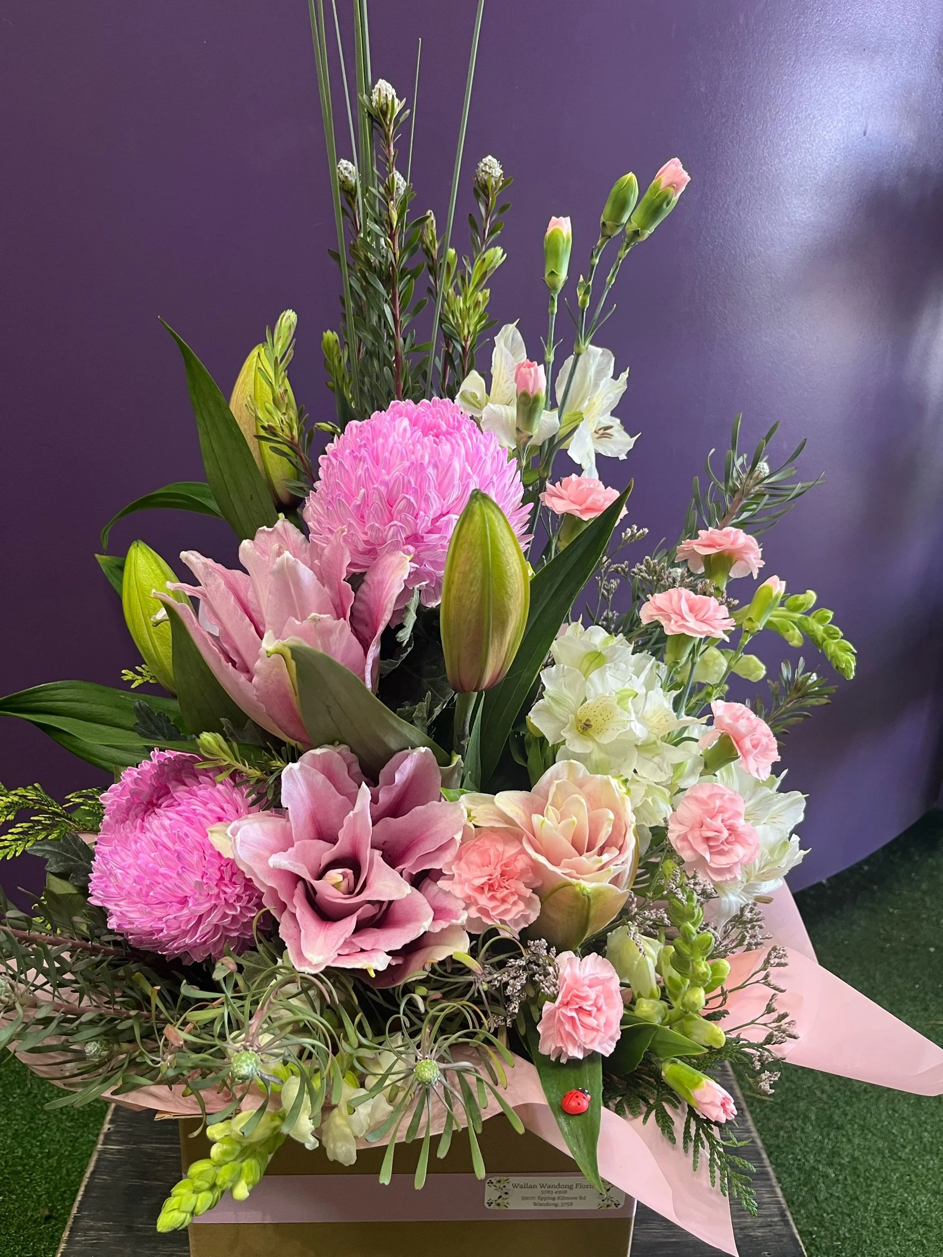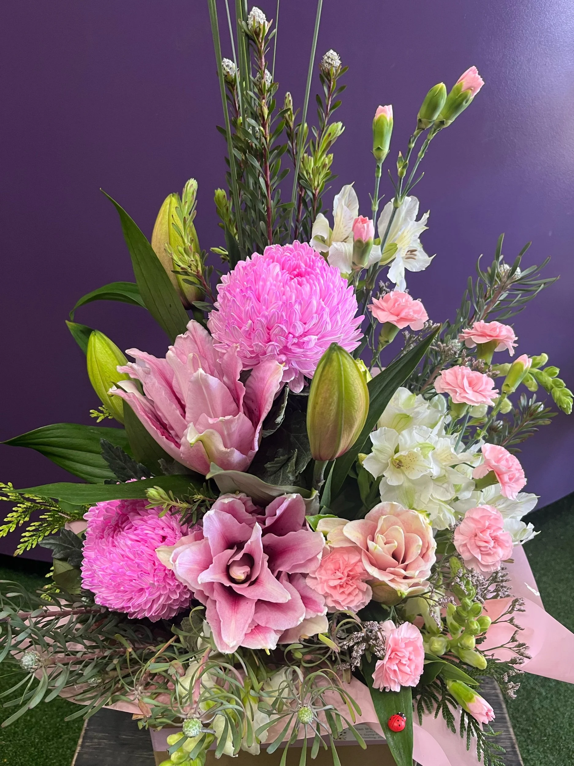 Shop › A pretty box in pinks 🩷 A pretty box in pinks 🩷 $100.00 This arrangement includes oriental lilies, disbud chrysanthemums, alstroemeria, carnations and snapdragons. 💕 This arrangement includes oriental lilies, disbud chrysanthemums, alstroemeria, carnations and snapdragons. 💕 Quantity: Add To Cart Added!