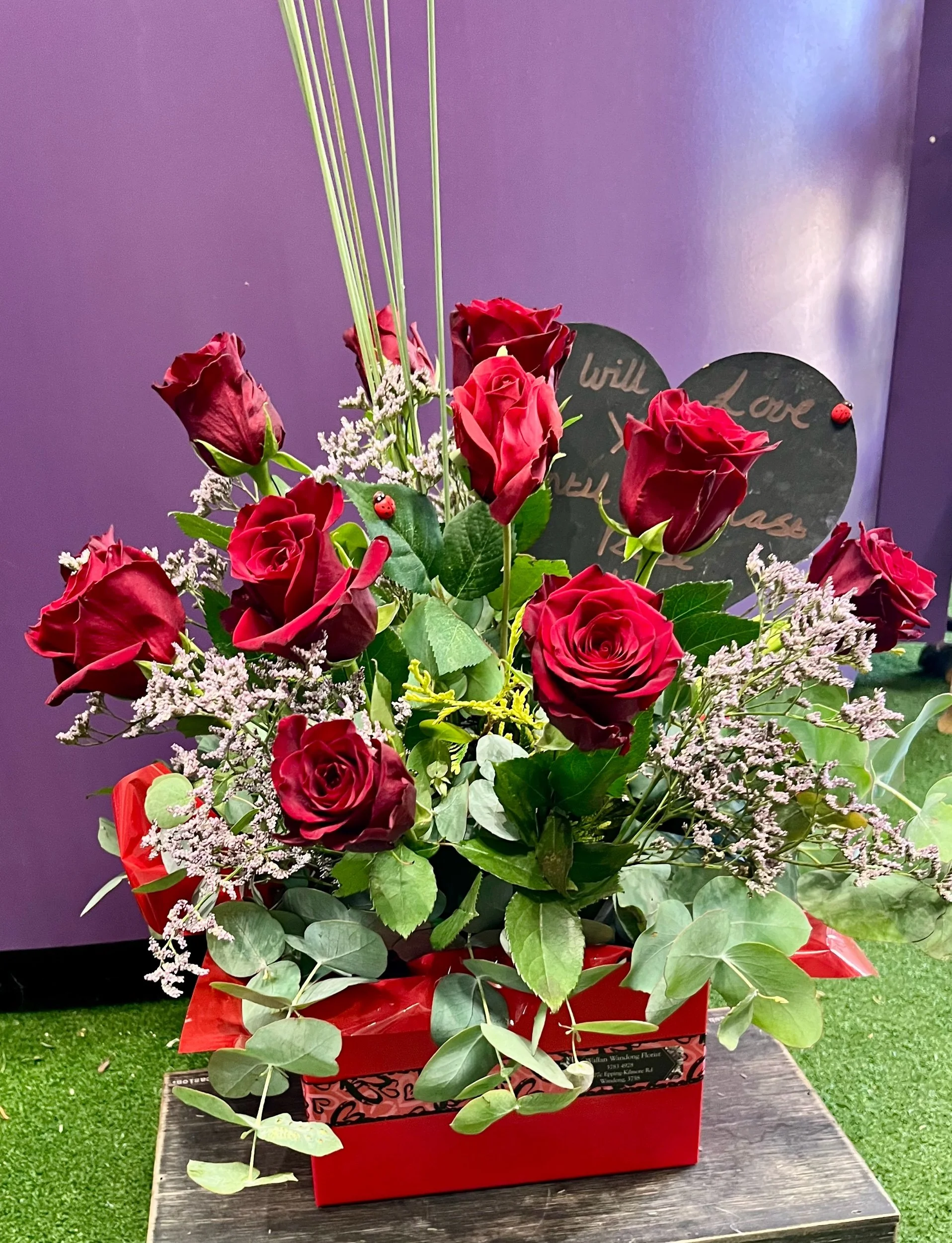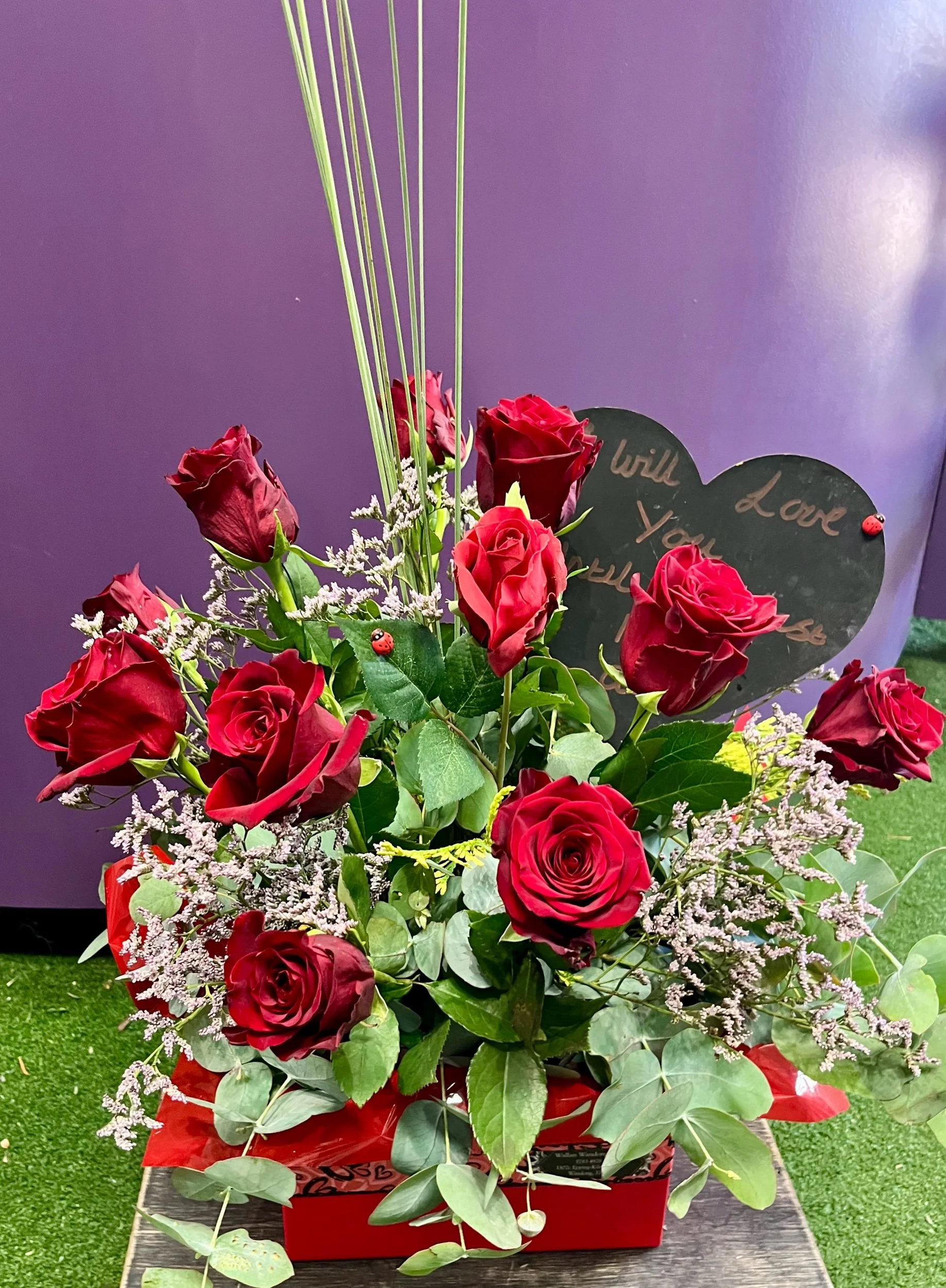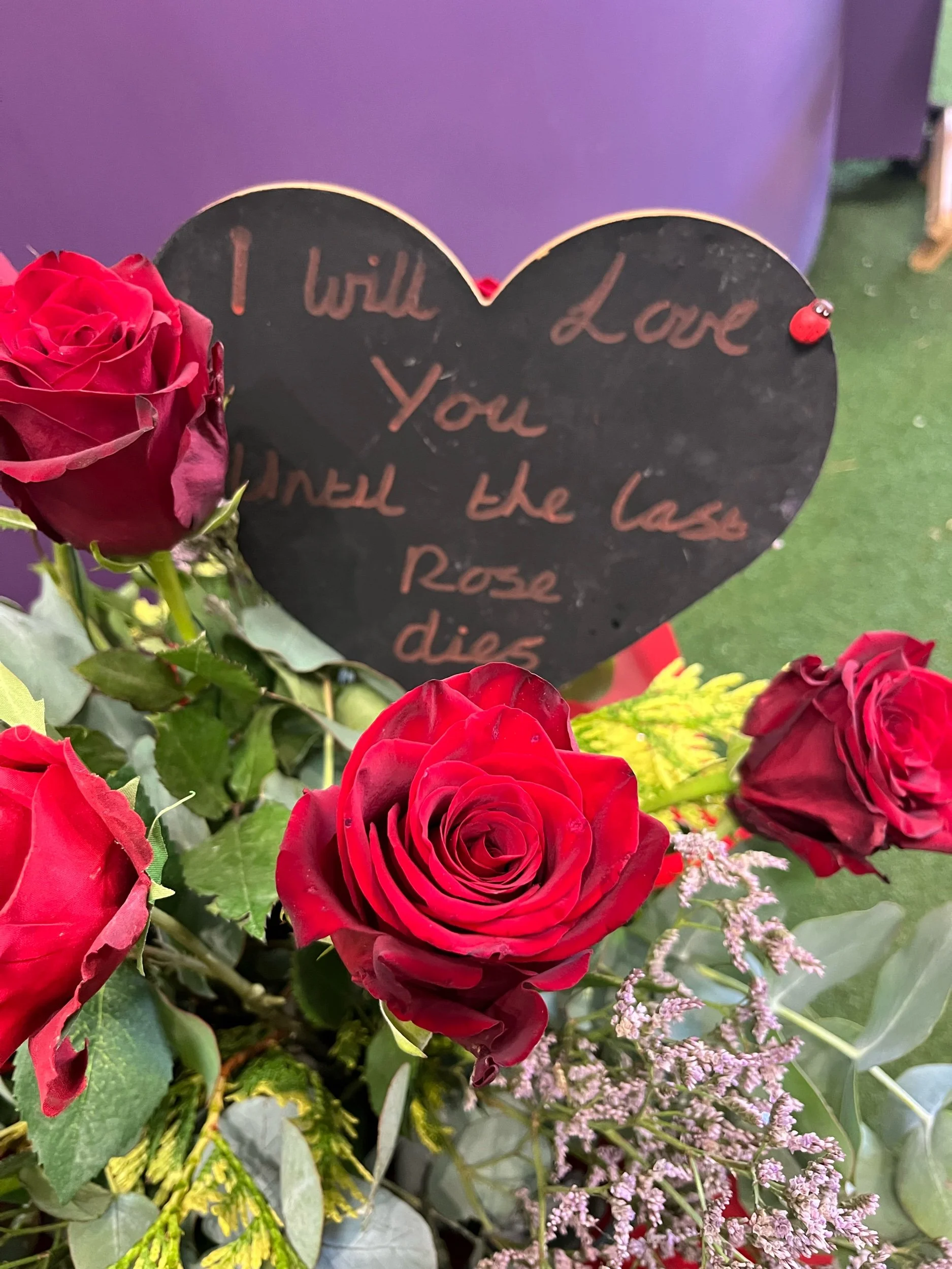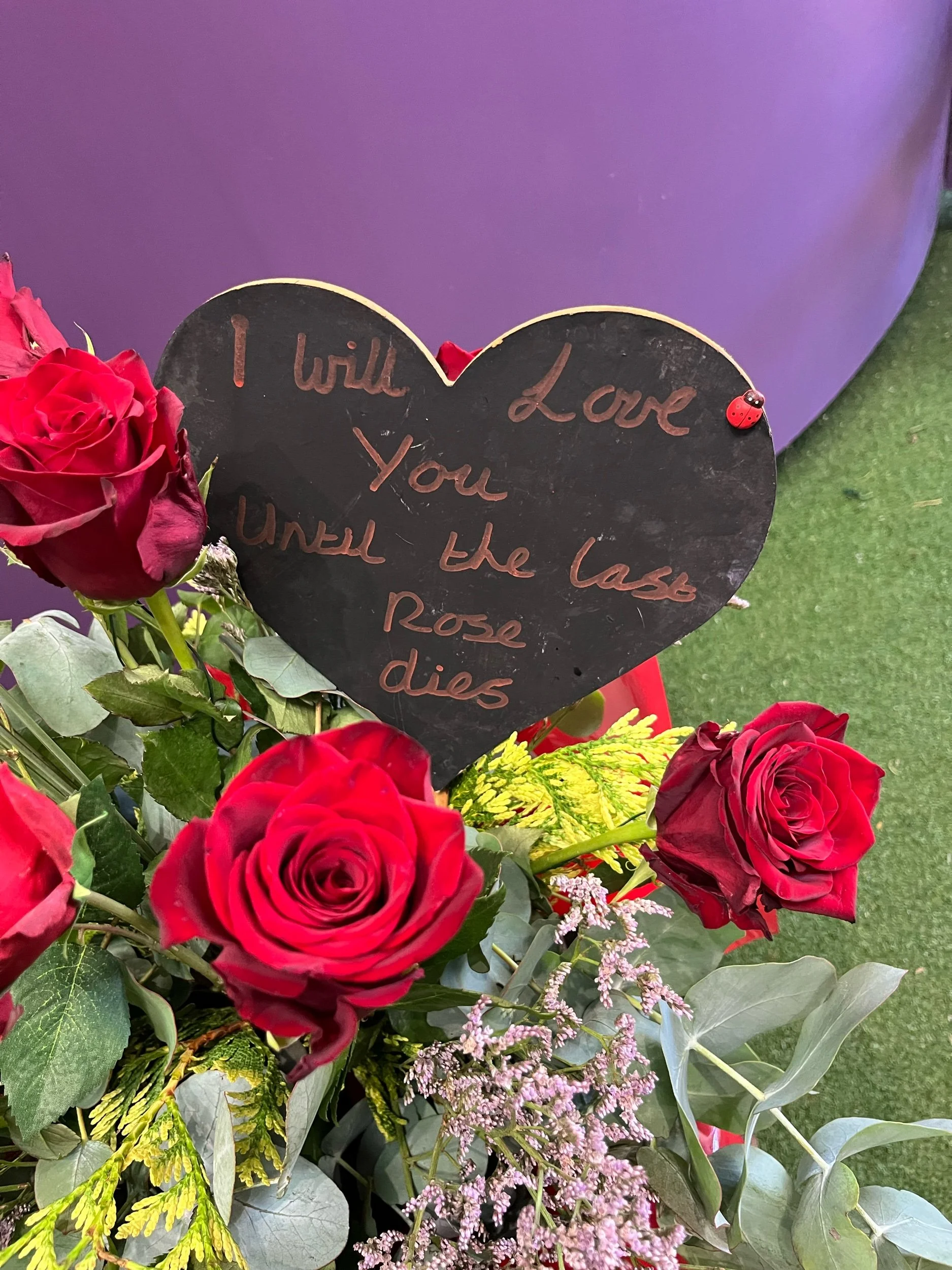 This arrangement is made up of eleven fresh roses and one artificial. It comes with a love heart blackboard reading, I will love you until the last rose dies. πππΉ