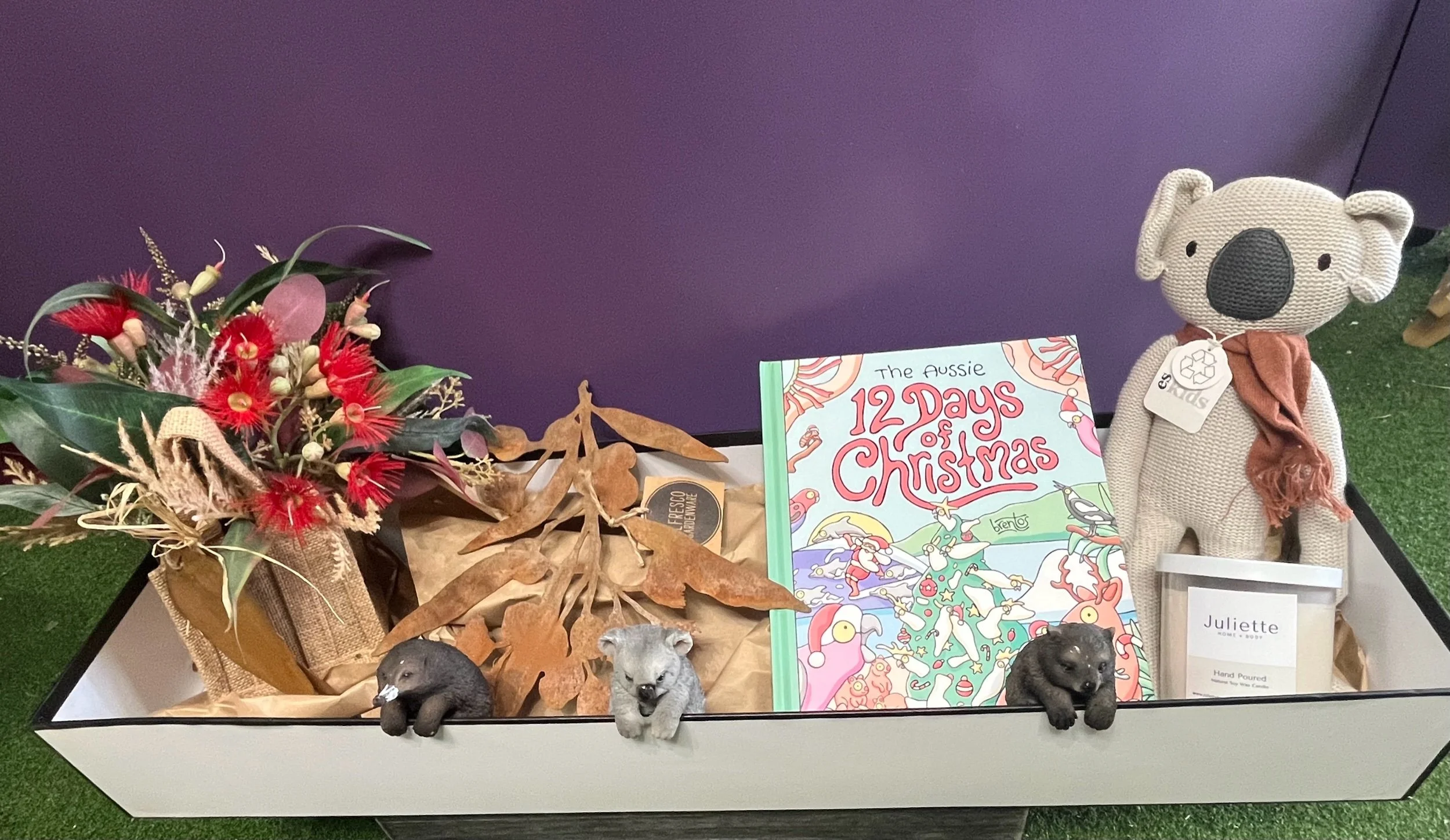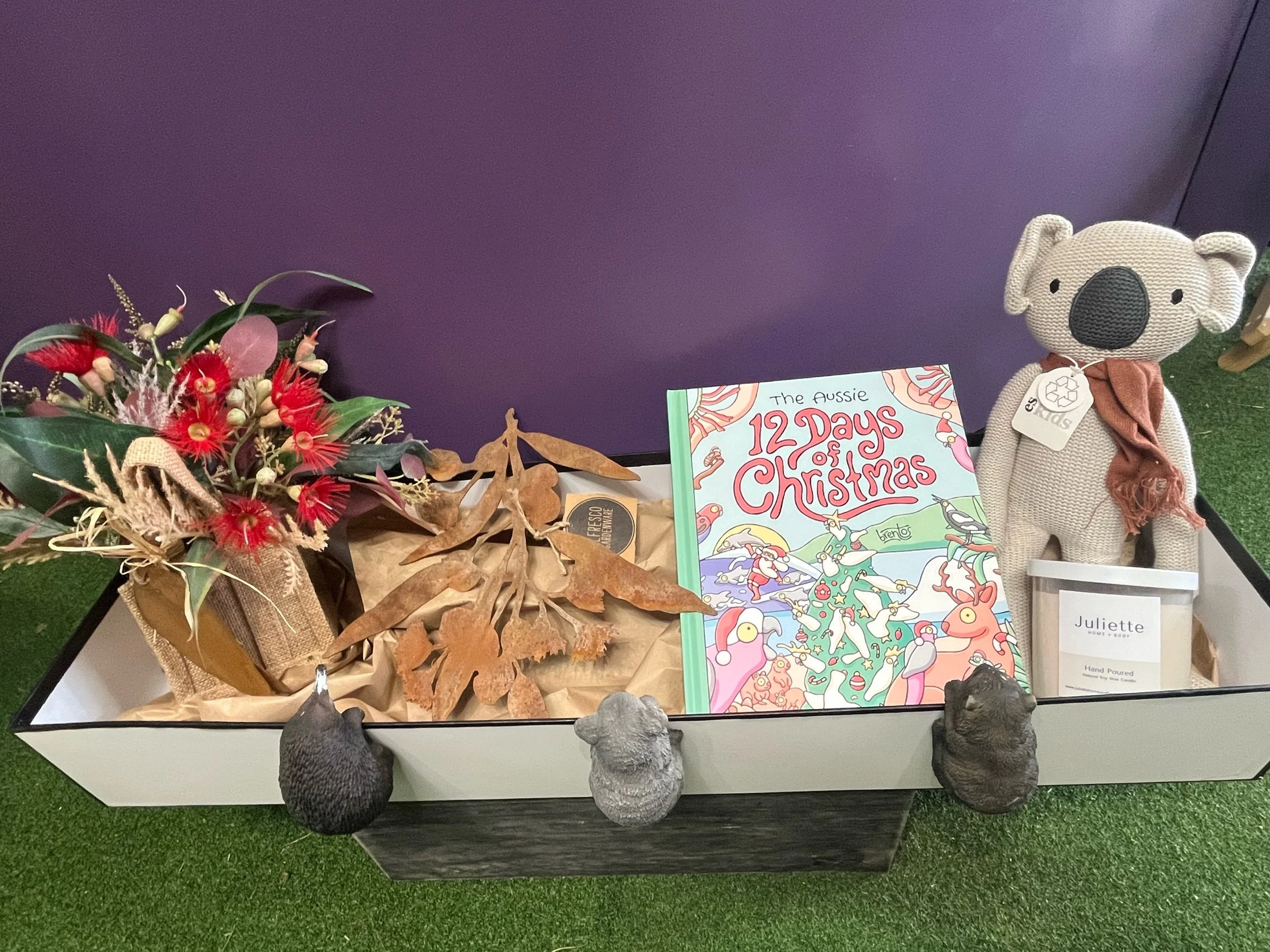 This beautiful gift boxed present contains the Aussie 12 days of Christmas picture book, a eco friendly cotton Koala, a hand poured Australian Bush natural soy wax candle, a flowering gun artificial arrangement in a hessian bag, a rusted steel flowering gum and gum leaf silhouette and 3 adorable pot sitters, a koala π¨ an echidna π¦ and a wombat. What a beautiful Christmas present to receive π π» π