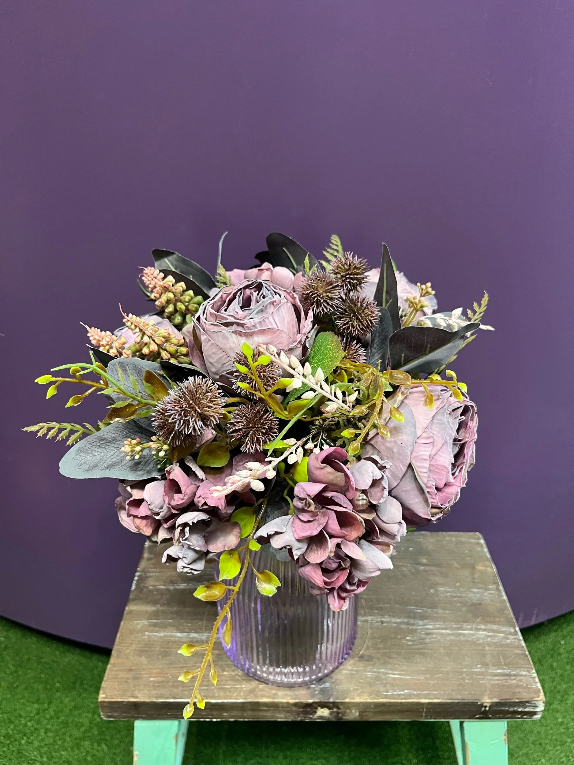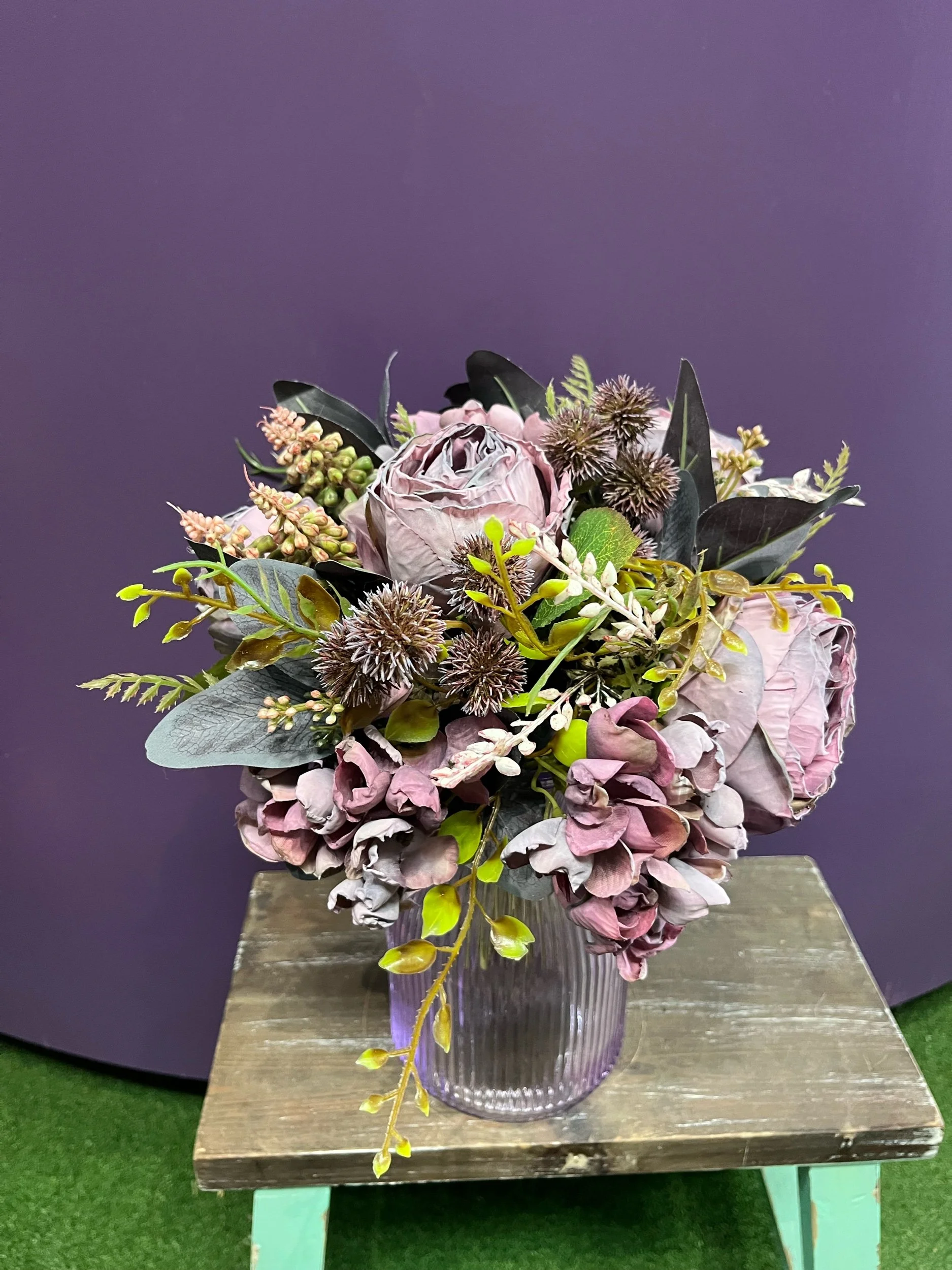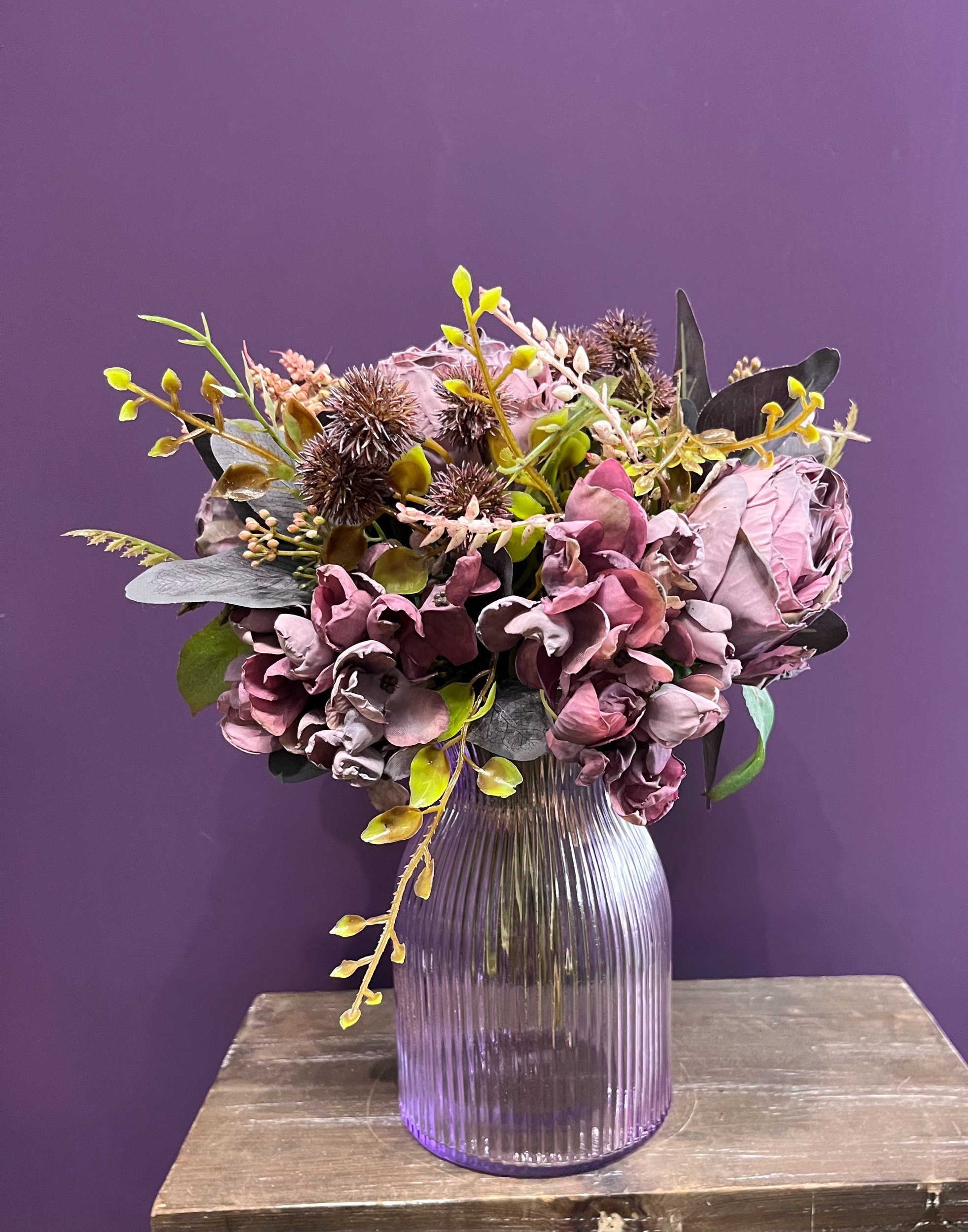Gorgeous artificial posy that you have to look twice at to see it’s not real and then you still can’t believe it. It is accompanied by our new stunning purple vase. 💜🪻💜