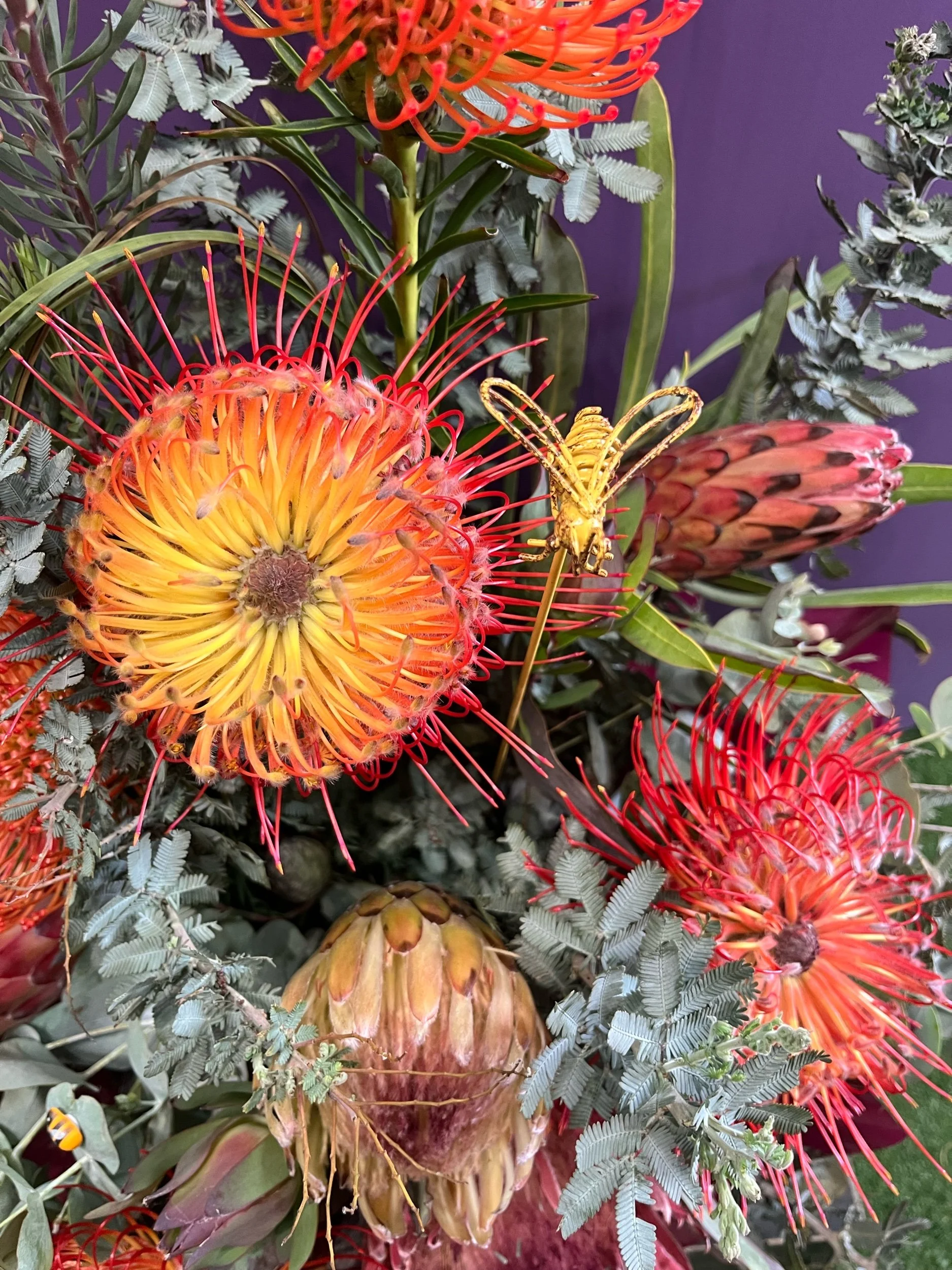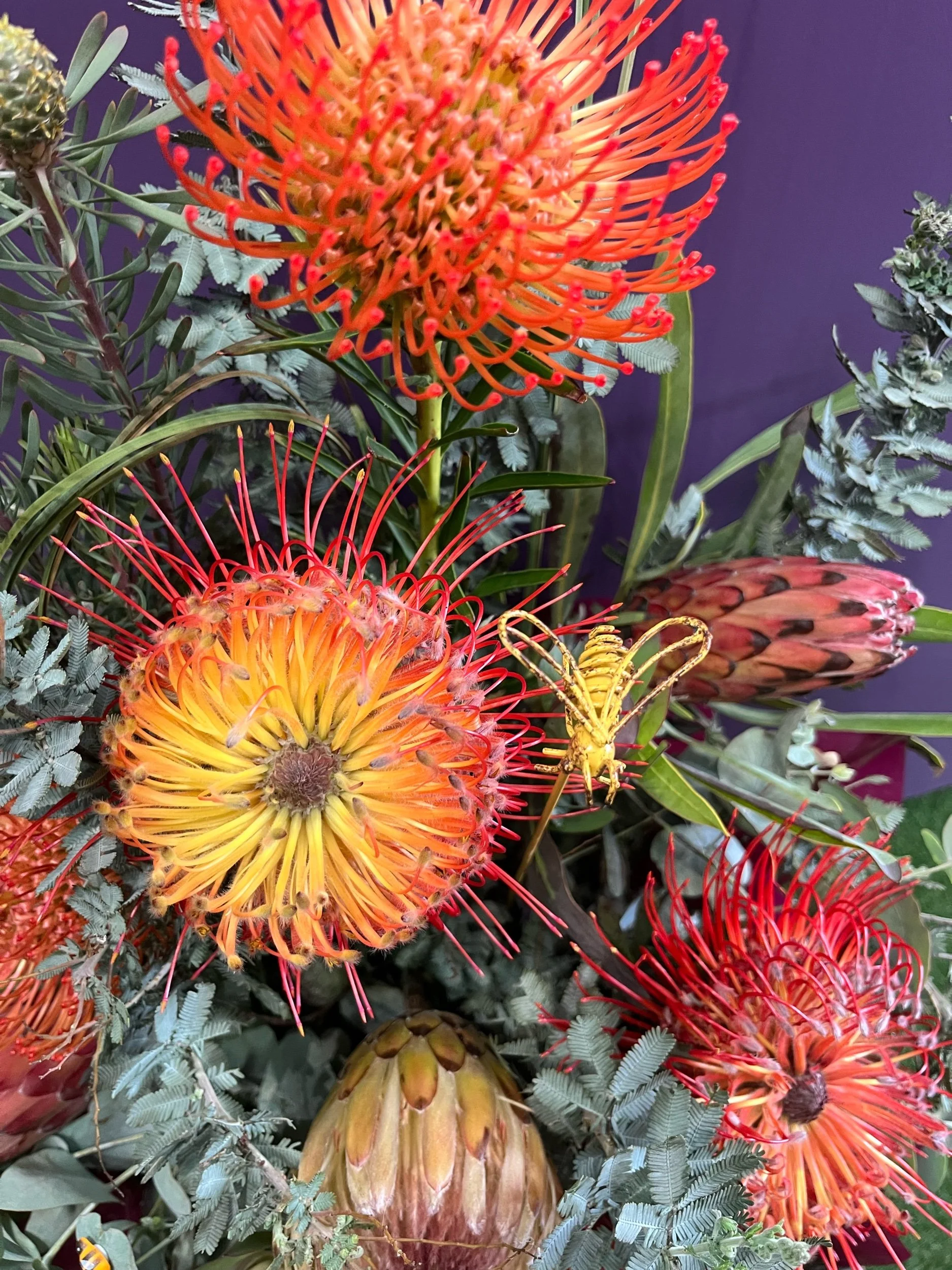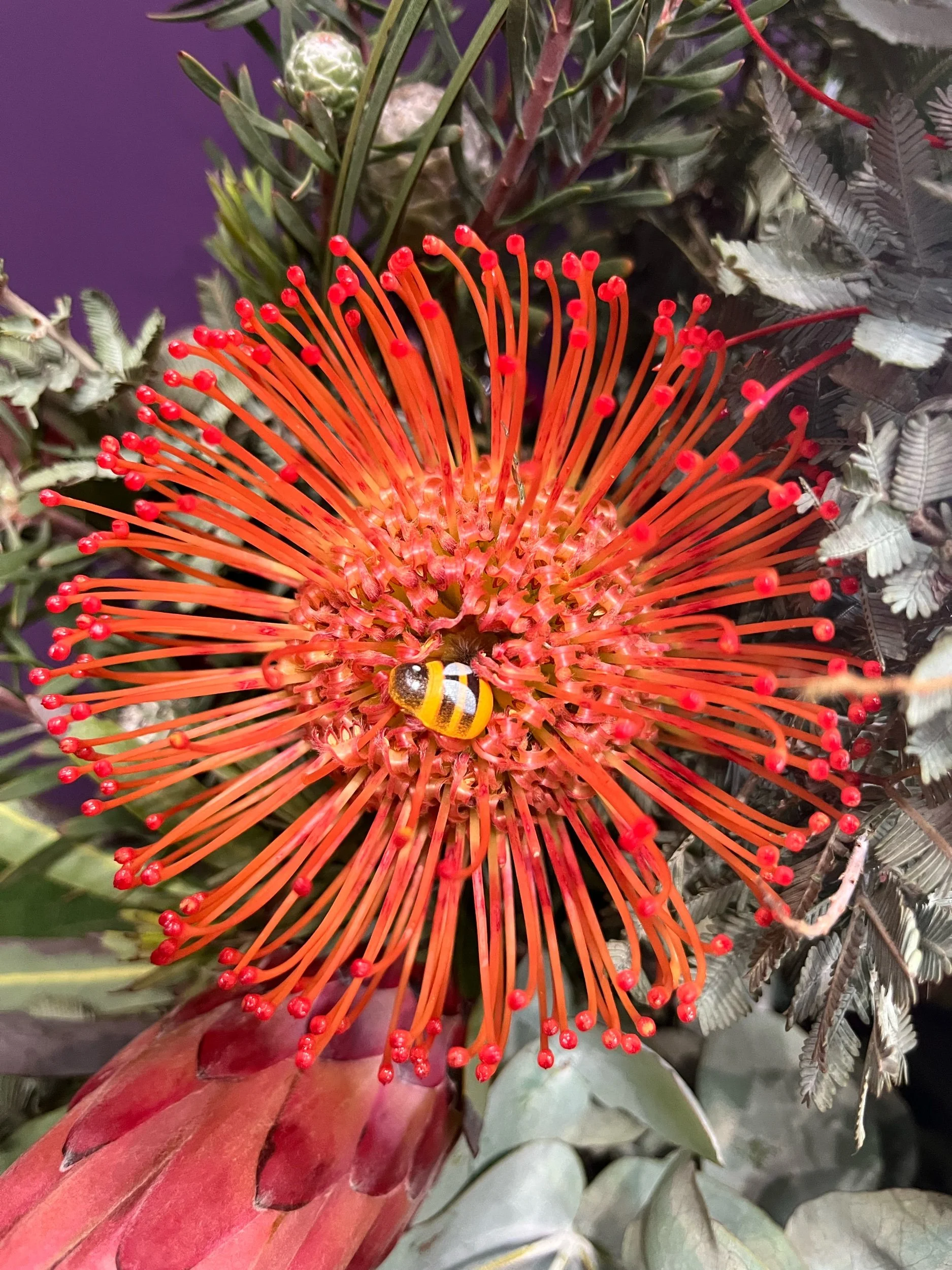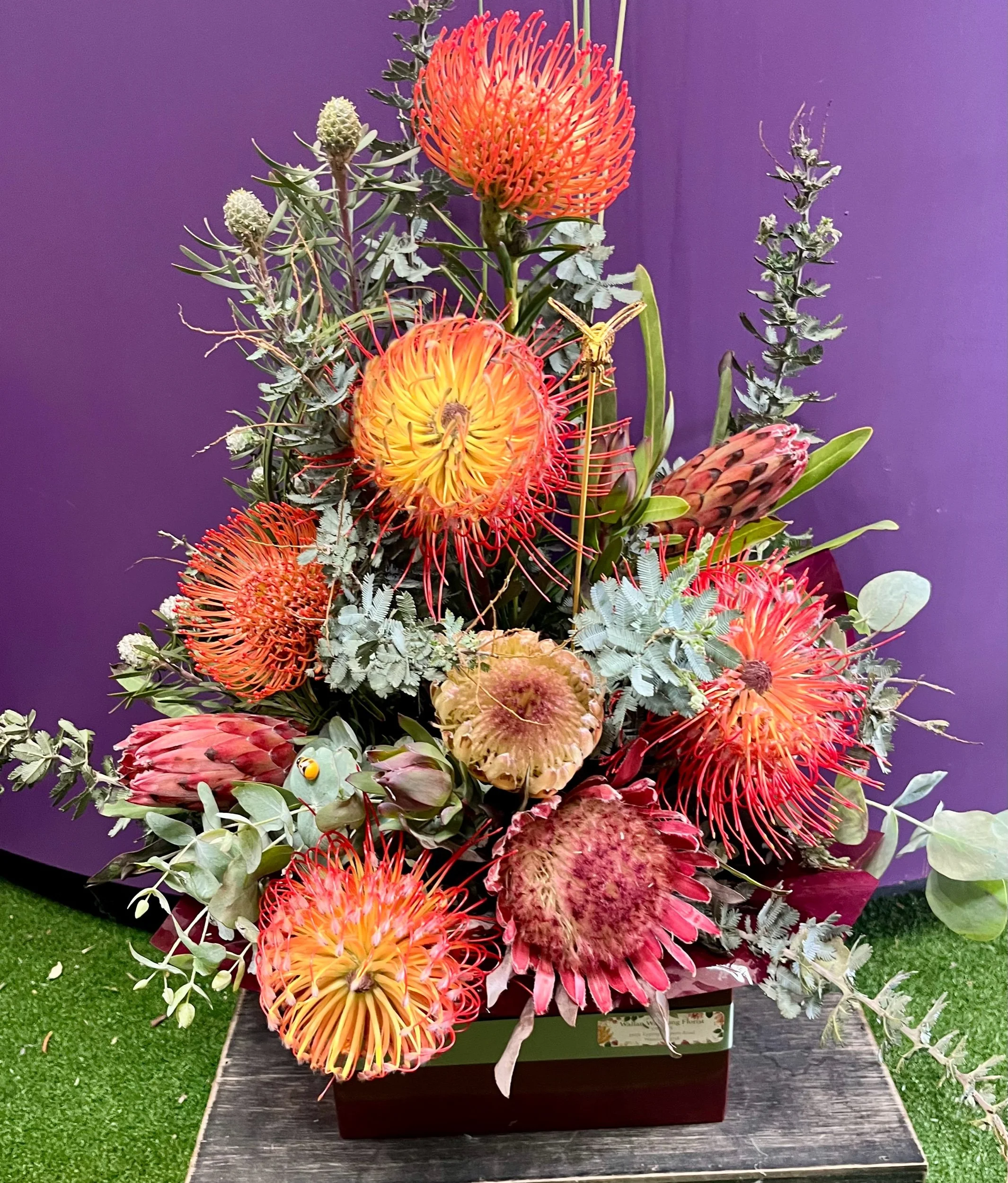 This native box arrangement comes with a variety of in season Native stems and foliages and a metal bee stake to put into the garden or a pot plant and it it topped off with an adorable little buzzing bee 🐝