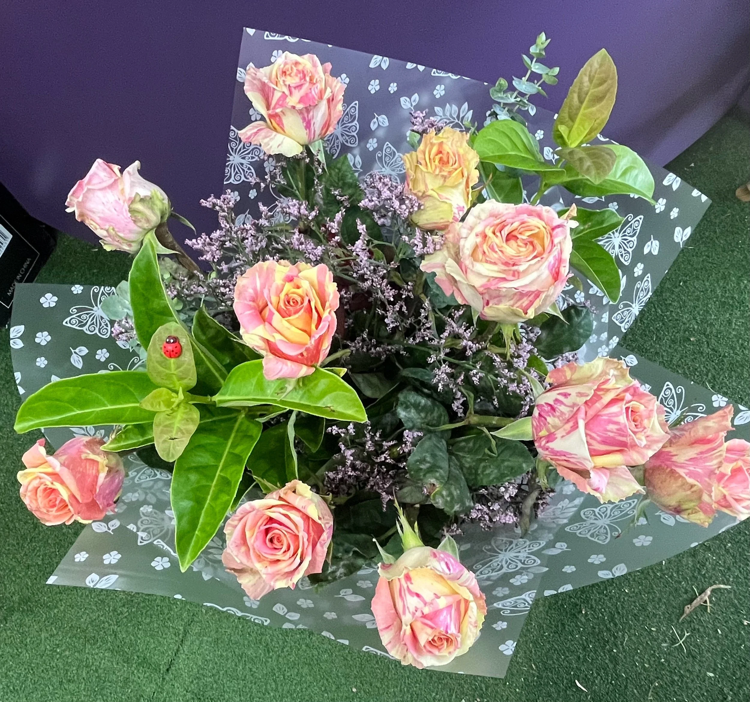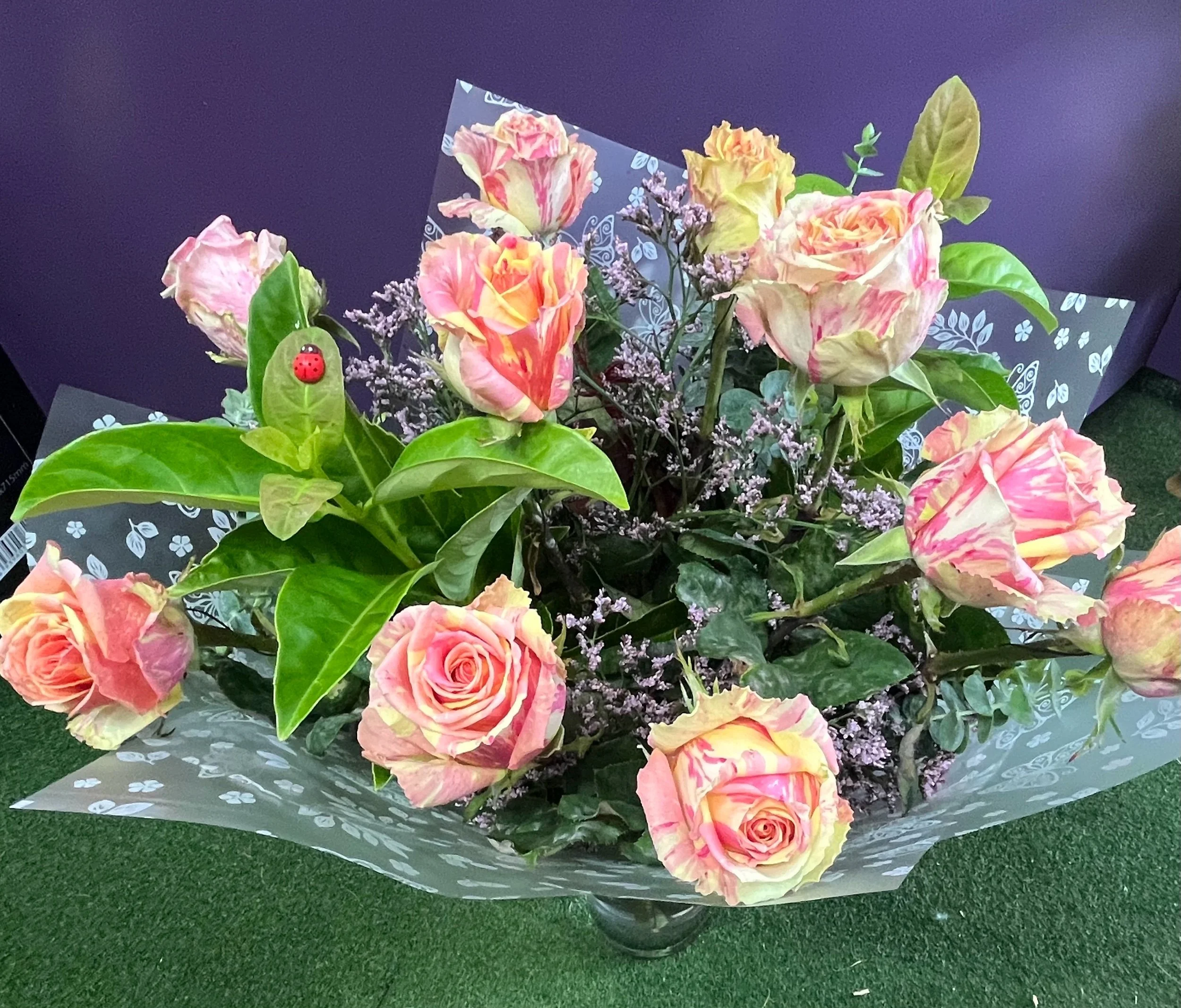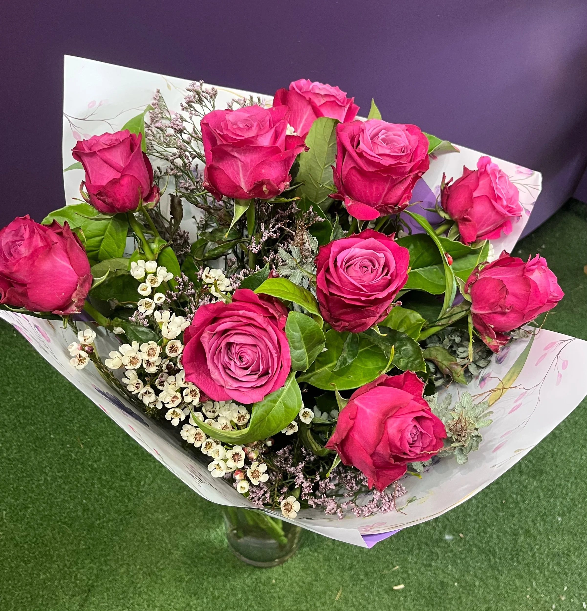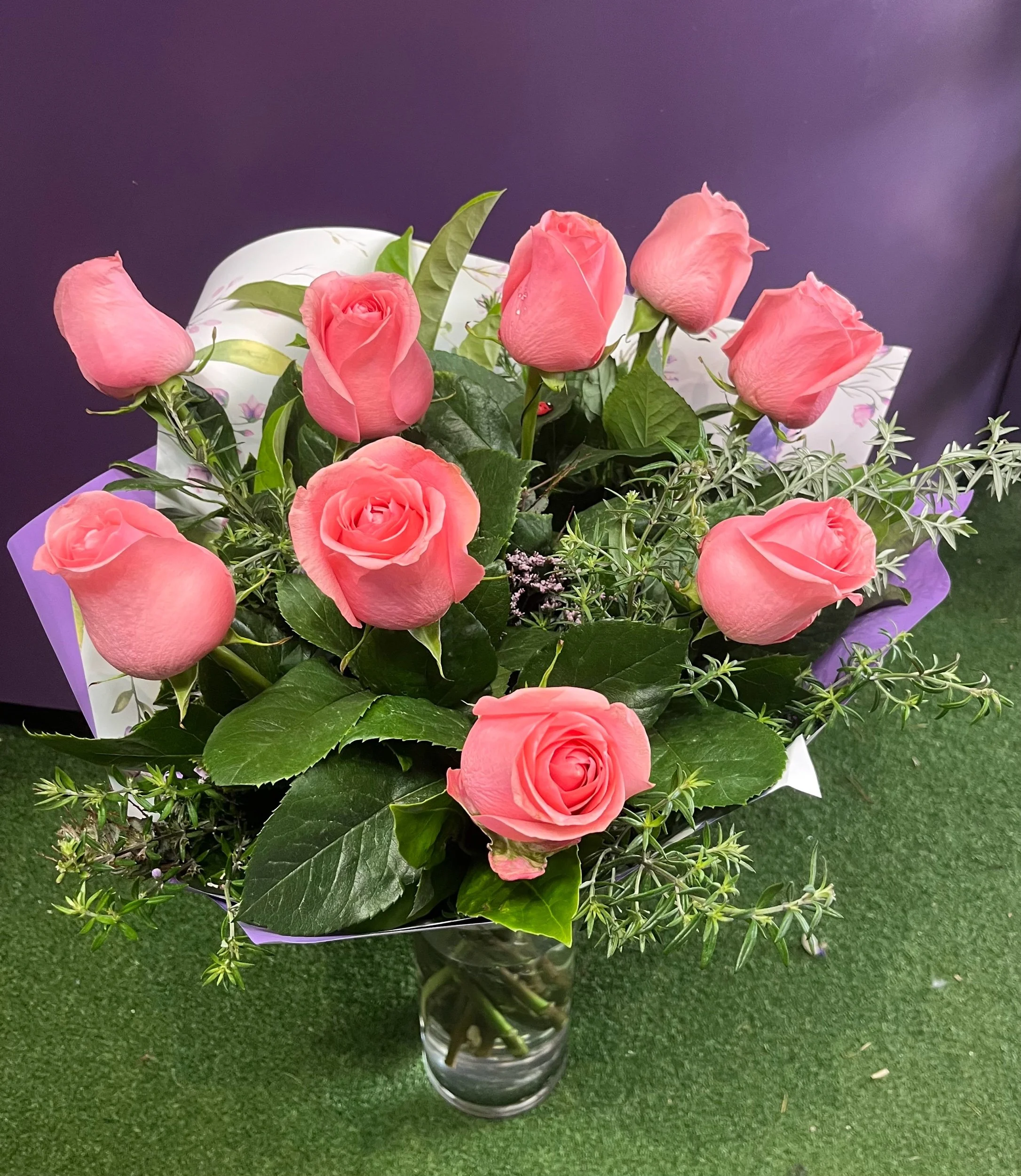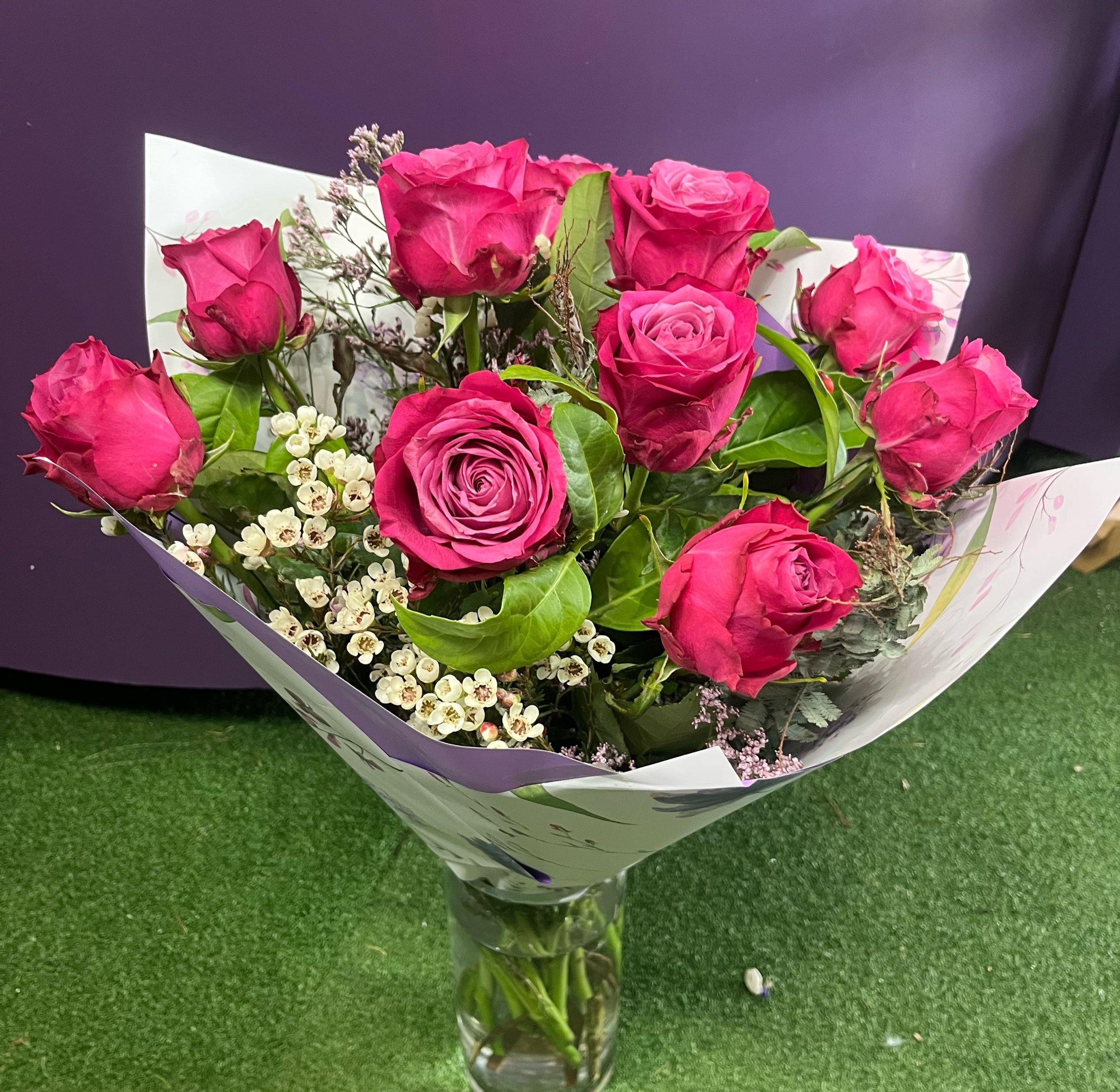 stunning long stem rose bouquet consisting of 10 long stem roses and foliage. Choose from hot pink, soft pink, mid pink or apricot.