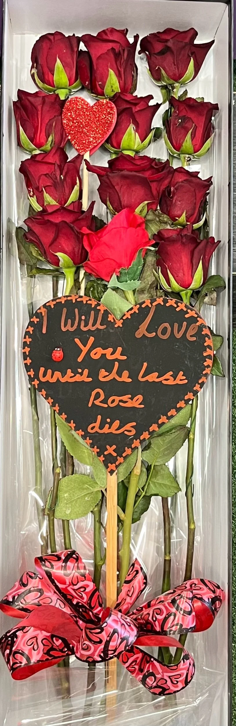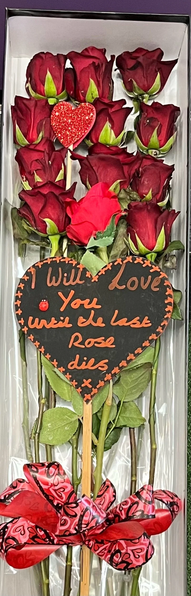 This presentation box comes with 11 beautiful red roses and one artificial red rose to make up the 12. An adorable heart blackboard reads “I will love you until the last rose dies”. The artificial rose and blackboard being a lasting gesture of everlasting love🌹❤️🐞