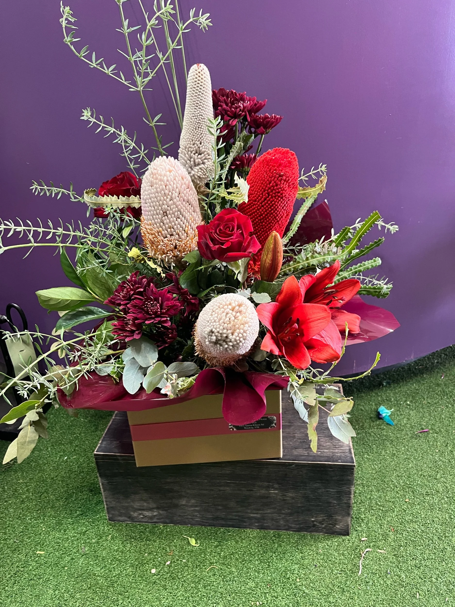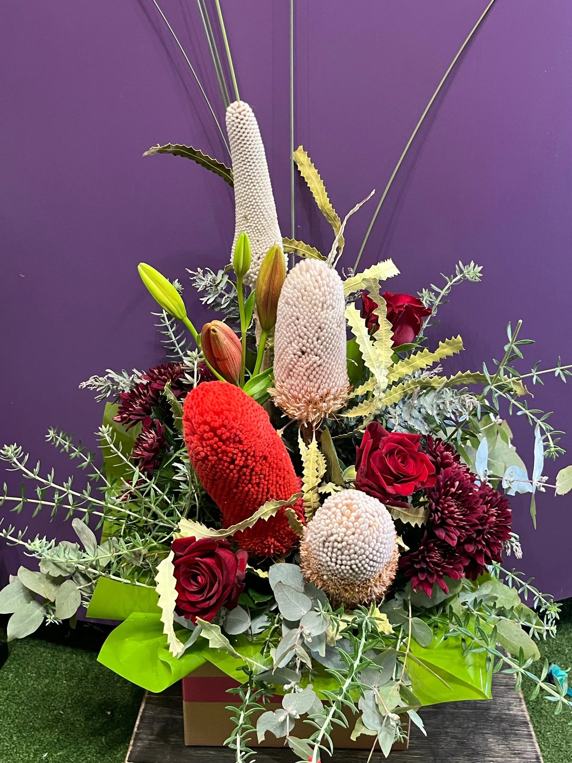 Shop › Banksia beauty Image 1 of 4 Image 2 of 4 Image 3 of 4 Image 4 of 4 Banksia beauty $150.00 This box contains stunning banksias, roses , chrysanthemums and asiatic lilies. Add To Cart Added! This box contains stunning banksias, roses , chrysanthemums and asiatic lilies.