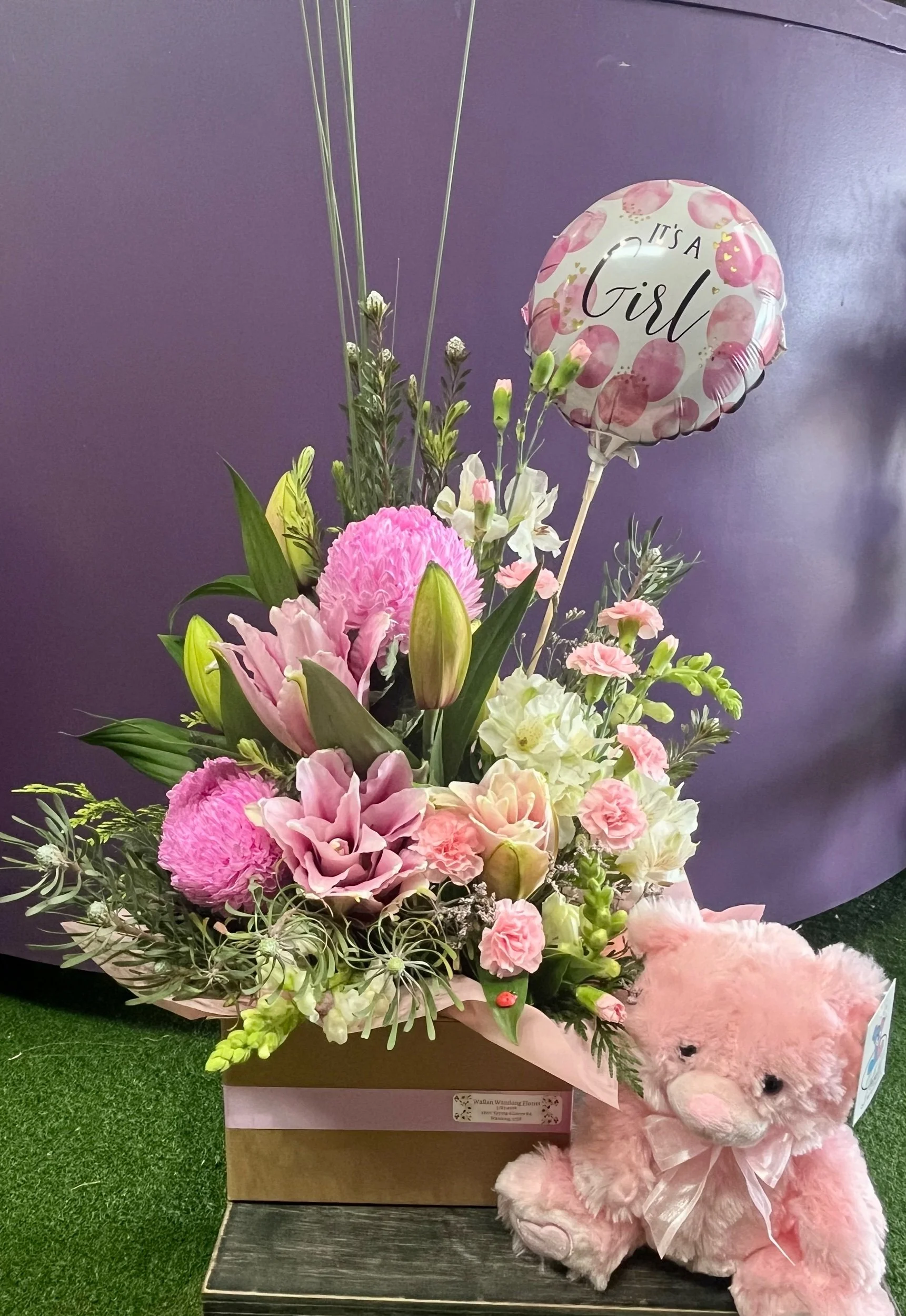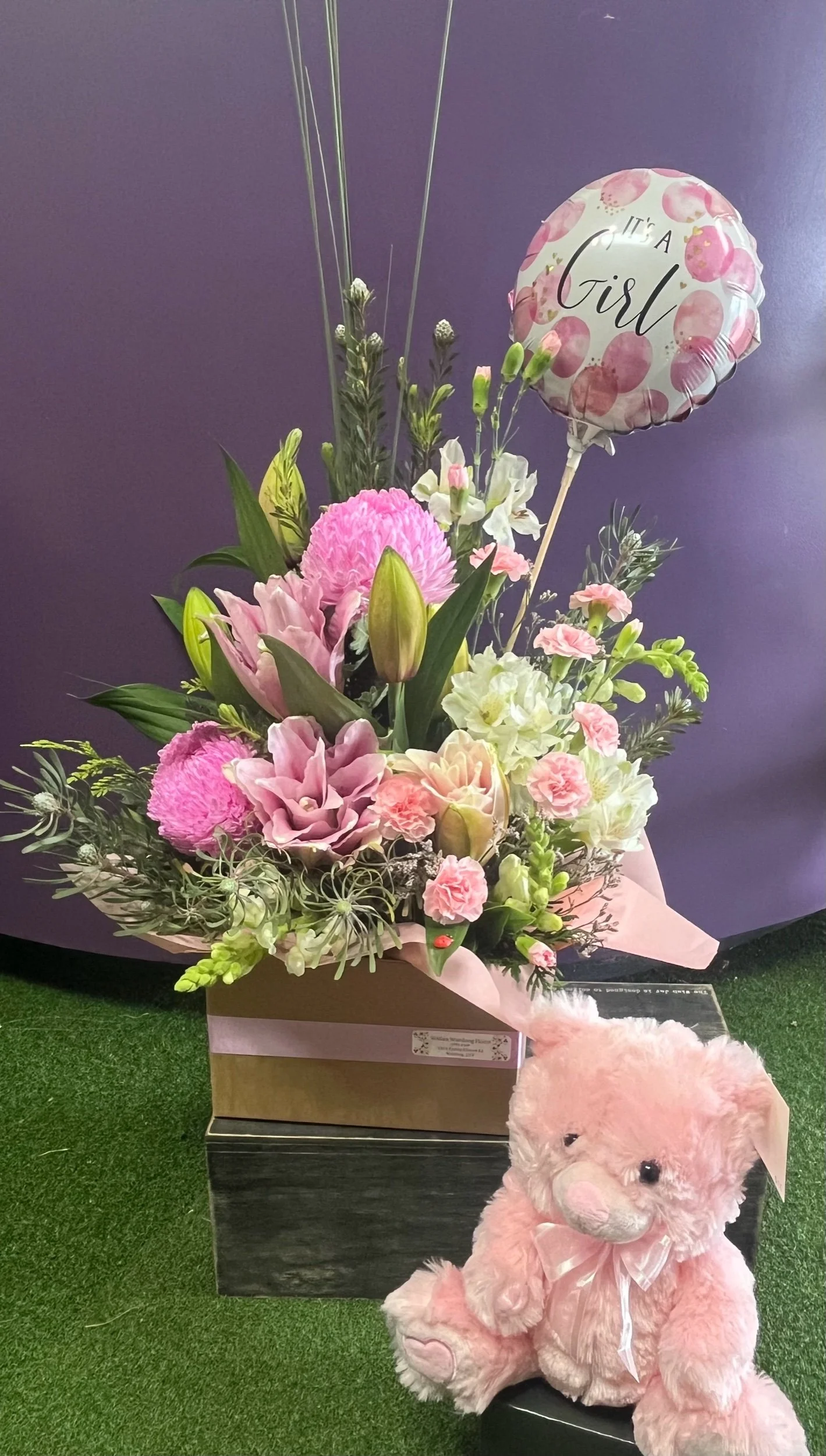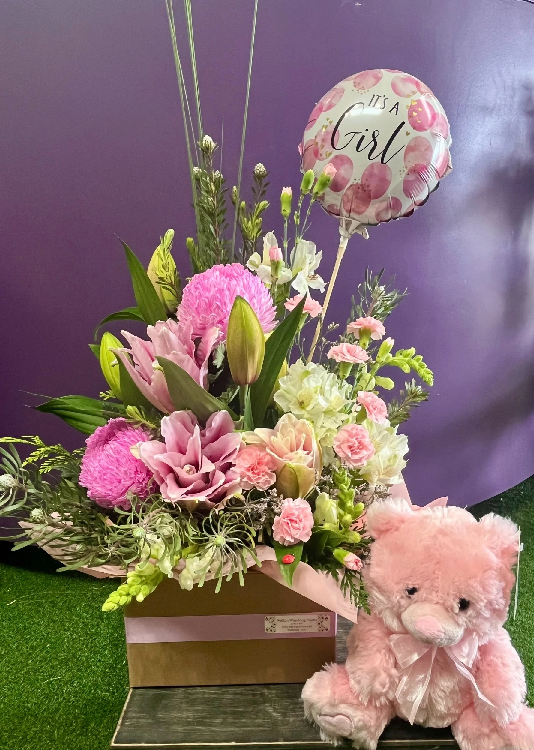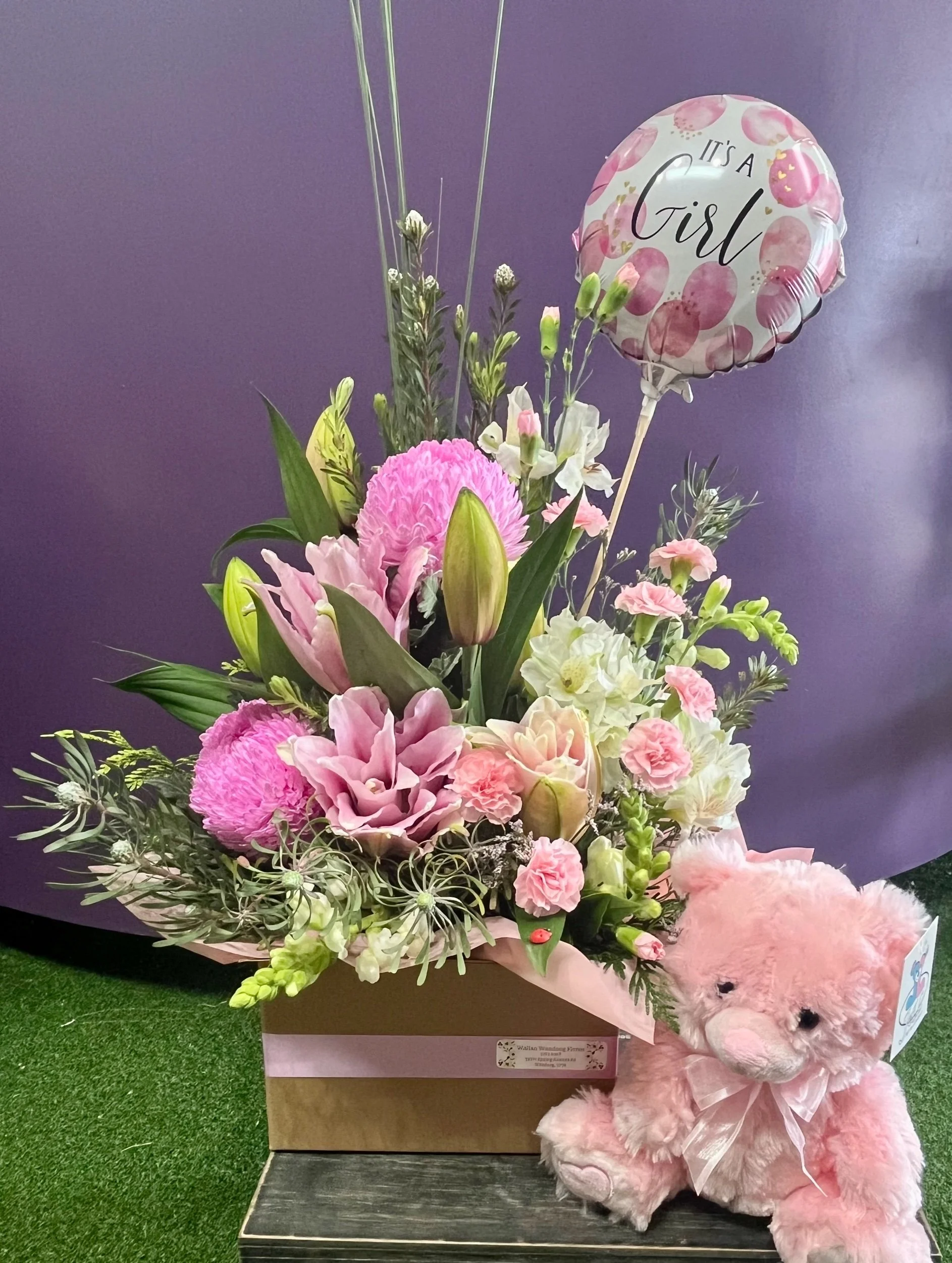 This lovely pink box arrangement comes with an It’s a girl balloon and a pink teddy to welcome the little one into the world 🩷